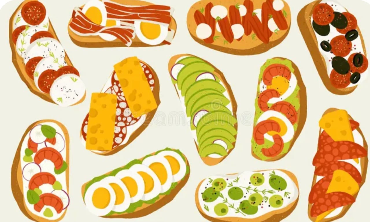 BRUSCHETTA: served on a thick slab of bread, usually grilled. Toppings are serious.