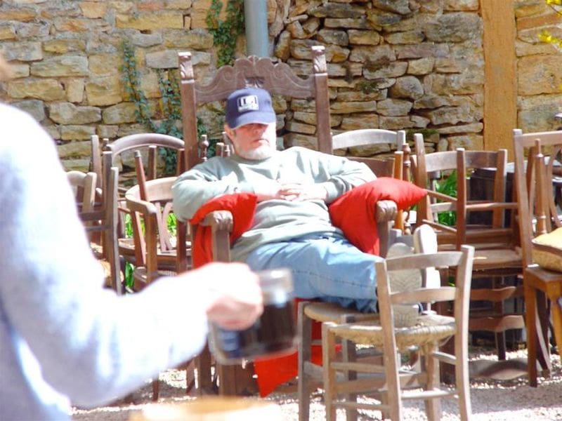 At 10:30 or so, the work stops, for casse croûte –literally, ‘breaking bread crusts’– a tradition for laborers, or ouvriers. Out come the sawhorses and plywood to make a long table. Vin blanc appears, then sausages, slabs of cheese, and big crusty baguettes. The dust-covered crew all stand around the makeshift table, quizzing Pierre about his family artifacts and teasing him about his rock collection. Friend Monty decides Pierre should start collecting something new, and he has a good idea. “May I suggest feathers?”