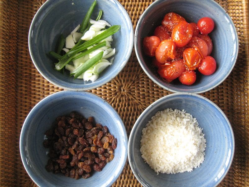 Back at the vide grenier party, interest in lunch mounts as the big farm table in the summer kitchen is set for the crowd. The kitchen crew buzzes around the stove, and wonderful aromas drift and swirl around the courtyard. When the command is given—“Madame est servi!”—the crowd dusts themselves off and bustles in, jockeying for seats and filling wine glasses. Big bowls of delicious toppings for the spicy dish cover every free inch of the table and are passed round and round as the rice and steaming curry is heaped onto plates.