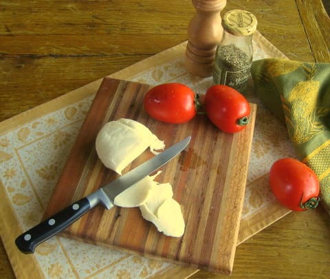 Slice tomatoes thinly, remove some seeds so they won’t be so juicy, and leave them in a colander to drain while you prepare pizza. Roll out dough and brush with 1 T. olive oil. Slice cheese as thinly as possible. Top dough with tomatoes, then with cheese and basil. Spinkle with sea salt, pepper, and herbs. Drizzle remaining oil over all and bake 20 to 30 minutes. If using a pizza stone, shorten cooking time and check at 15 minutes. And grazie to the Italians, who invented this lovely pizza!