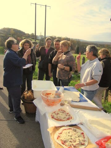 It’s 7 am in Balleure, and Frédéric, our stand-in baker for the day, is stoking up the four á pain, the wood burning bread oven. It takes 3 hours for the fire to be the right temperature for the baguettes. The oven is ancient, in a tiny stone building that maybe four people can stand in, if they’re good friends (and, it’s hot). At 9:00 the volunteer work crew—residents of the hamlet of Balleure who are the boulangers du jour for the surrounding villages, start to straggle in. It’s a fine sunny day, and the sleepy staffers go right for the coffee. Nicole, clipboard in hand, has assigned tasks to everyone and has taken advance orders for the bread and the pizzas they’ll be making. There are already orders for 60 loaves and 70 pizzas, and that doesn’t include those who will be drawn in by the wonderful aromas wafting through the village.