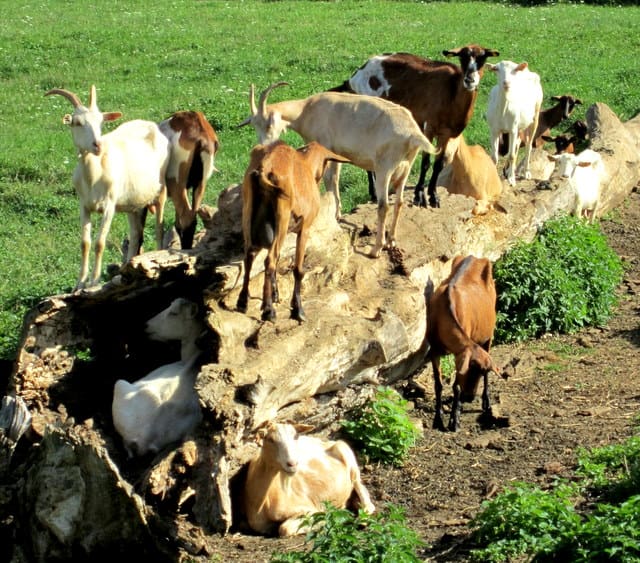 A note from Lynn: Here, from Herm in Phoenix, an ode to the Intelligent Goats of La Vineuse! Salut Lynn, Thought you might enjoy the poem I wrote to go with your “Goats on a log” picture: Goats on a log in a field of lush green What kind of story is behind this scene? A herd of nannies on a make-believe crest Several are standing, a few are at rest One might wonder, is this part of a mini caper? Or a live photo-shoot by the local newspaper There must be an intriguing story for us to read Maybe with a prince riding a pure white stead Alas! There’s no sensational story to behold It’s just a game to see who’s next to fold The last one standing fits the bill To be known by all as “Queen of the Hill”