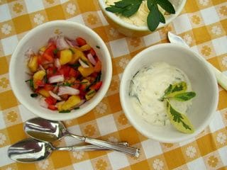Peach salsa: combine 2 finely chopped peaches with 1 tablespoon finely chopped red onion, 2 T. finely chopped red bell pepper, 1 T chopped, seeded jalapeno pepper, 1 tablespoon finely chopped cilantro or parsley, 2 T. lime juice and 1 T. olive oil.