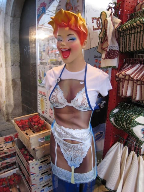 Was the top photo taken in Avignon?? I have almost identical photos taken along a tiny stream lined with restaurants and little shops in the historic center, during the theatre festival. Those wild, laughing mannequins…