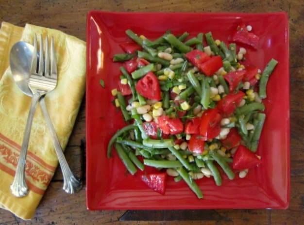 White Bean and Haricot Vert Salad with Tomatoes: Steam green beans until tender crisp, then plunge into ice water to cool and retain color; drain well. Put beans in large bowl and add a can of white beans, drained. Add some chopped and seeded tomatoes, and some cooked corn (canned, frozen, or cut off the cob if you’re ambitious). Toss with French dressing #1 (see blog, June 17) to which you have added some crushed garlic, and plenty of chopped fresh basil, or your favorite fresh herbs.