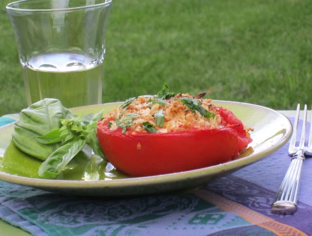 Tomatoes Baked with Goat Cheese: Pascale, who lives in my friend Ellen’s village, taught her this easy trick: Slice a big summer tomato in half and scoop out the interior (and save it for your brushetta). Fill the interior with a plump morsel of very fresh goat cheese, and bake for about 30 minutes in a 375(190c) degree oven. Top with parsley. This makes a great starter for a dinner party.