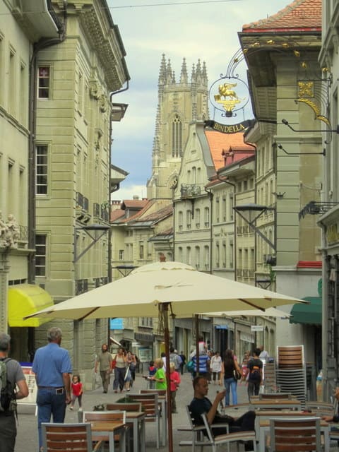 We took a long week-end last month and went to Fribourg, a walkable, charming town near Bern, the capital. The commercial area, pretty in its own right, is at the top of the hill, and deep in the valley is the quiet, medieval part of town. You can walk down and take the funicular back up. Here is a factoid I love about the city: the river divides the town into German and French speakers. On the French side they pronounce it free-boor and on the German side, fry-bourg. Love it that these sometimes contentious groups can’t even agree on the pronunciation of their city’s name.