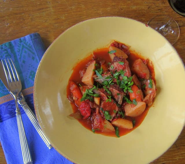 Put pot in oven, covered, and cook 30 minutes; add carrots and cook 30 more minutes. Add potatoes and cook another hour or more, until beef and vegetables are tender. (At this point cool it and refrigerate or freeze, if not serving immediately).