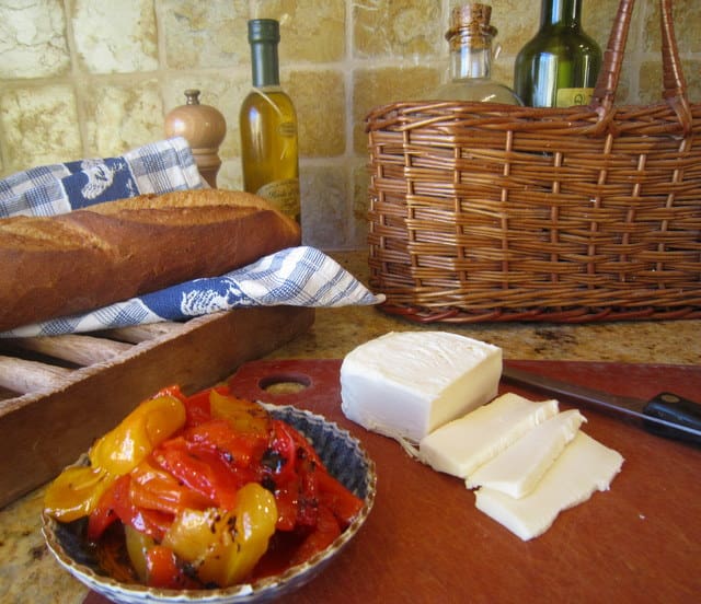 Pre-heat oven to 425 degrees (220C). Drain peppers. Sauté onions slowly in olive oil for 15-20 minutes. Drizzle inside of sliced baguette with a little olive oil. Fill baguette with pork slices, peppers, onions, and cheese. Wrap in foil and heat about 15 minutes. Slice into quarters and serve, with lots of napkins.