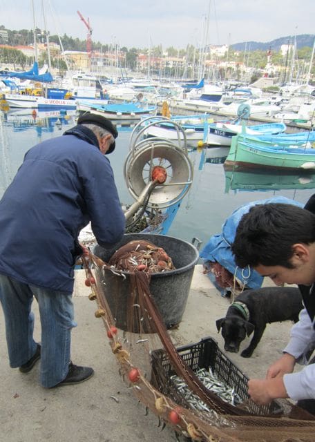 I love all the contrasts in France, so I was delighted to find the modest working boats of the local fisherman parked alongside the shiny yachts in the lovely, half-moon of a harbor in St. Jean. I wandered down to the makeshift fish stall that pops up a couple of days each week, in search of something for dinner. Les pêcheurs were busy pulling out the hundreds of tiny, silvery girelles that were caught in their nets. These will be deep fried and served as frittures. They are eaten whole, the bones and head just adding to the crunch. There was also a frightening looking creature called a lotte, with a wide head, bulging eyes and serious teeth. He was still alive and gasping for air, pauvre bête. Then there was un poulpe, a whole octopus, looking rather gray and slimy.