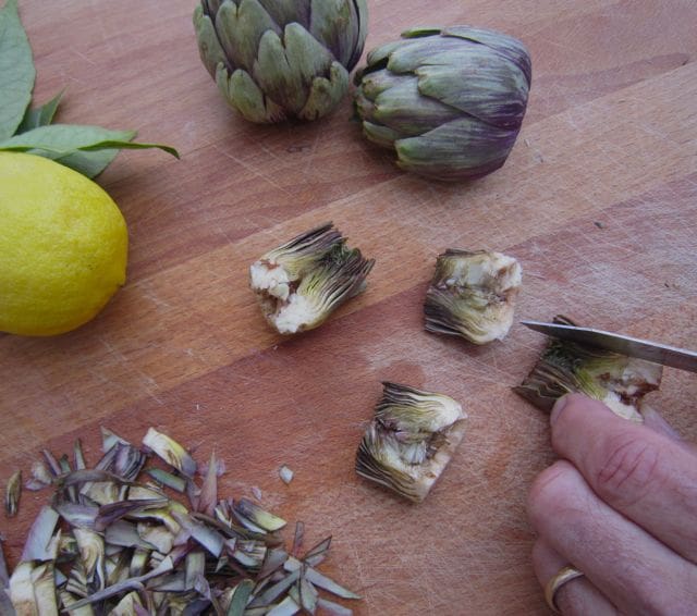 Cut the globes from the woody stems. Remove the outer leaves, just the ones that are easy to pull off, leaving the tighter inner leaves. Remove the soft, fibrous core at the bottom, by making a cone-shaped cut with your paring knife. Next cut off half an inch of the remaining leaves at the top. Cut it in half and you’re ready to slice, lenthwise (see photo, and note below). Slice as thin as you can; the leaves will separate as you slice. If you’re making a large quantity, put them in a lemon-water bath to hold them as you prepare them, they turn brown quickly.