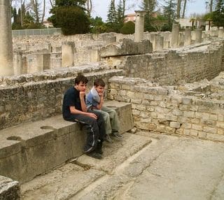 Aiming south, we drove through Chartres and through the Loire Valley to our final destination, the B&B, Domaine Saint Luc. Located in their own vineyard in Drôme Provençale just an inch north of Provence proper, it had been recommended to us by a friend who said the accommodations were clean, the food good and the wine fantastic. What we found was charming beyond belief. The 18th century farmhouse had simple guest rooms with modern bathrooms (YES!), amazing food (we later found out the owner was in Town & Country magazine as the best B&B Chef in Provence) and their vineyard which produced a Côtes du Rhône Village and a Coteaux du Tricastin that delighted us every evening. (Photo: the boys on the Roman toilets at Vaison La Romaine).