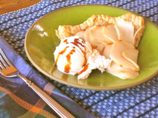 Remove from oven and immediately sprinkle the tart with a tablespoon of vanilla sugar. If you prefer you can brush the pears with melted apricot jam. (We can buy vanilla sugar prepared; or just store a sliced vanilla bean in your granulated sugar. Or add vanilla extract to your cooked pear mixture and use regular sugar). Cool and serve in slices with vanilla ice cream.