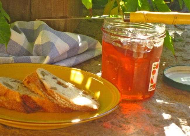 The French adore fruit, especially in desserts, but I think their favorite must be that symbol of love and lust, the apple. What do they do with les pommes of autumn? Well, the other day Nicole brought me a jar of her homemade gelée des pommes (apple jelly, above). “I make it because it’s so beautiful,” she said, holding the translucent golden essence of apple up to the light, and watching it sparkle. Painting by Libby Mathews.