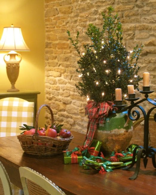 Your photograh says everything Christmas…the small tree on the table with the basket of apples, a bow, candles…it is lovely and it makes me want to be there. ….,