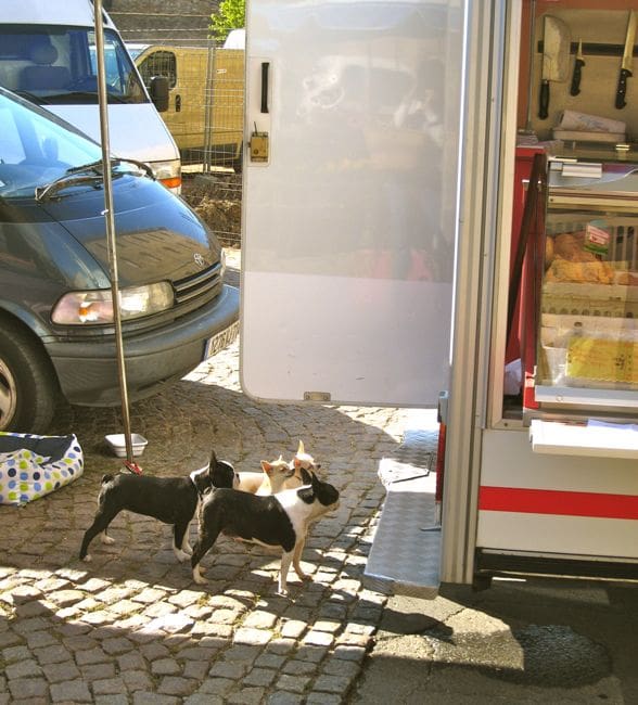 Photo: At the market, the Butcher's pups eagerly await the leftovers from the Choucroute garnie.