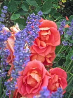 orange and you've got a big space, you won't find a better focal point for the garden than Fellowship, also called Livin' Easy. It's a beauty: flourescent orange, opening to an orangey-apricot with a gold center. It always reminds me of a perfect sunset, rolled into one bloom. The bush gets big and round and full, very lush, so that it's a pretty plant even when it's not blooming. Mine is about 5 feet tall, 4 ft wide. Few diseases. Go here to see a good photo of its spring flush. LEFT: Another view of Mystery Rose #1, amongst the lavendar.