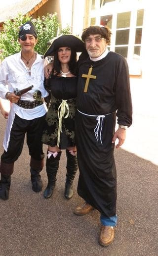 The theme: it was suggested that all participants and attendees wear black and white, for no apparent reason other than to provide costume opportunities. The speeches: short and sweet, yea! The music: the classic French accordionist, who was very good; accompanied, regrettably, by a female singer who definitely should not quit her day job. The food: picnic lunch under the tents. The entertainment: first there was a parade by everyone in the region who has an ultra-loud, muffler-free motorcycle, all gunning their motors and blowing their horns. This, thankfully, was brief.