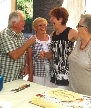 Photo: The Birthday Girl (right) shares a laugh with Pierre, Andrée, and Marie-Louise. She's getting ready to cut our local baker Adrian's fabulous cake, which had layers of fresh fruit inside.
