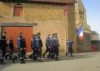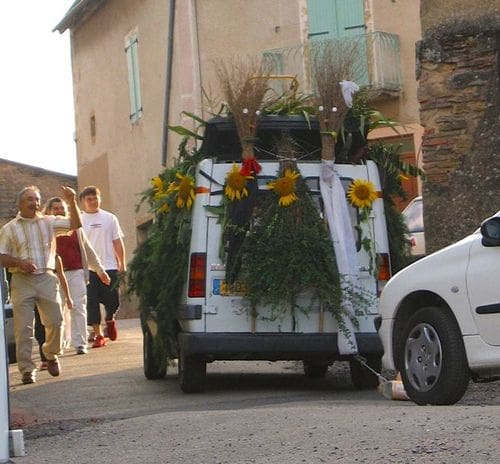 Life in a French Village is quiet, but dull it is not. Since we are on the main village road, there often seems to be a procession of some sort passing by: an antique car rally appears out of nowhere, or there’s a wedding at the church and the guests sashay by, the ladies sporting their outrageous, colorful hats. On memorial holidays the pompiers (fire fighters) step out smartly in uniform, to honor the war dead. I’ve walked out of the gate and nearly been run over by a cow, since the farmer often moves his herd to another field by way of our little road. Photo, above: A bride and groom depart in their camionette, thoughtfully decorated by their friends (Is that a coffin on top?).
