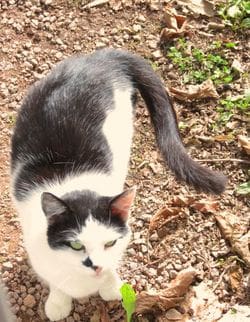 Photos: Above, the shower, au naturel, of Tony and Narissa. Both of them declined to be photographed for this story–chickens! At left: Be forewarned that you may not always have an appreciative audience while showering en plein air. Tony's cat Cléau