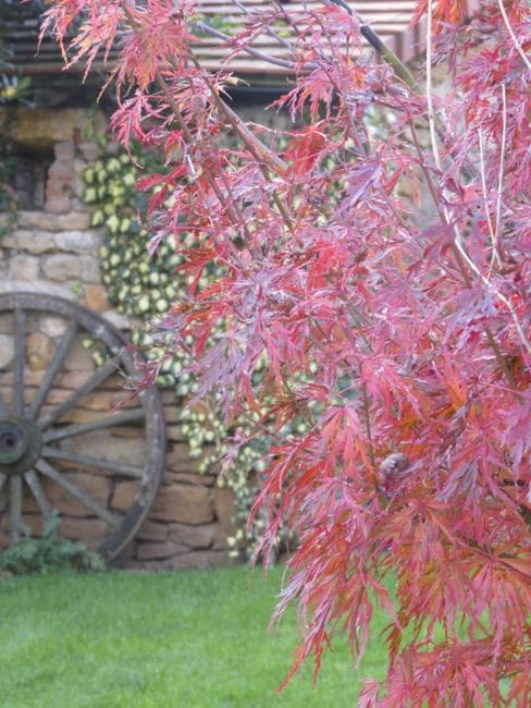 I hope some gardener can explain this to me: in temperate Charleston, grass turns brown in winter. In Burgundy (with a climate similar to the Washington DC area), the grass looks just like this, flourescent green, all year—even in the dead of winter. The tree is a cutleaf Japanese maple called 'Seirku'.