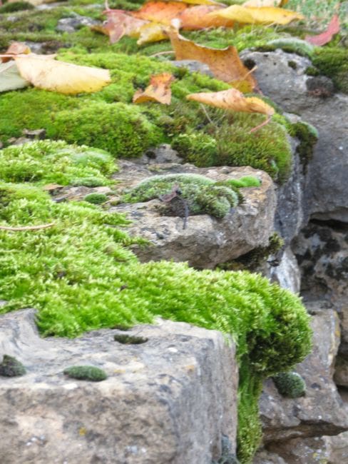 After a foggy couple of weeks, the moss, ever present on shady stone walls, is glowing green.