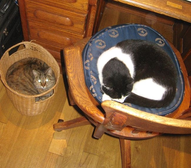 Our rescue cat Domino, sleeping in Ron's desk chair at the chat–eau. But wait, don't empty that trash can! Our neighbor's cat Meepia, also known as The Guest Cat, has snuck in once again. (She is sometimes also called Cupcake, in memory of the day this rotunde gourmand cleared several of them off of our kitchen counter).
