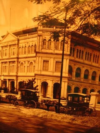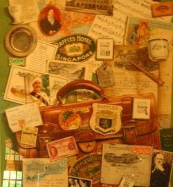 heat of early afternoon, pop music is piped in from speakers in a shiny new courtyard. And to try the traditional Singapore Sling in the Long Room? Well, these days that will set you back $30 a drink. They did have a nice little museum, though, where you could dream over the lavish Raffles lifestyle, back in the day. Photos above, from the Raffles museum. Below, the newly renovated Raffles.
