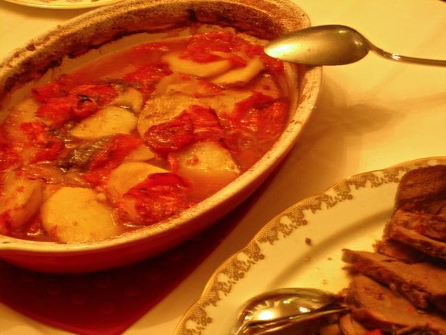 For the tian she cut regular baking potatoes into slices about ½” (1.25 cm) thick. Then, in a heavy stoneware baking dish (like Le Creuset or Emile Henry), she layered the potatoes with thick sliced tomatoes, thinly sliced onions, rosemary sprigs, and olive oil. She placed the roast, sized to serve 6, right on top of the veggies and cooked it in a slow oven (350F, 175C), uncovered, for about 2 hours. (My note: check your roast and vegetables for doneness after an hour; you can always pop the roast in a separate pan and continue cooking either veggies or roast longer as needed).