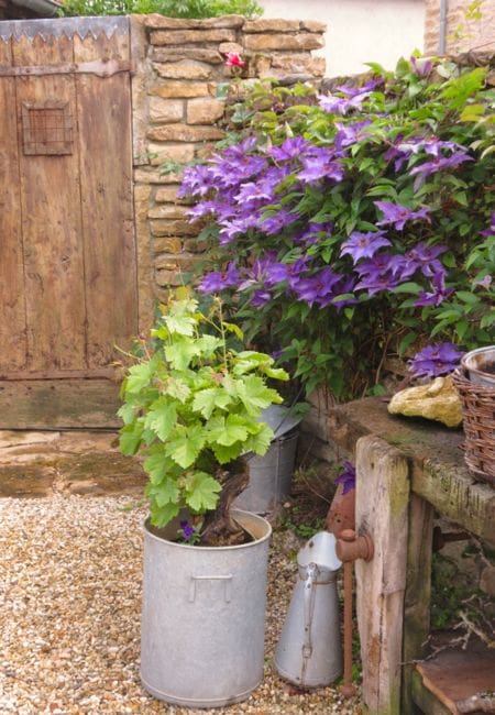 Behind the potted grapevine, my neighbor Jean-Marie has an a clematis that is époustouflant (amazing!), with blooms as big as saucers.