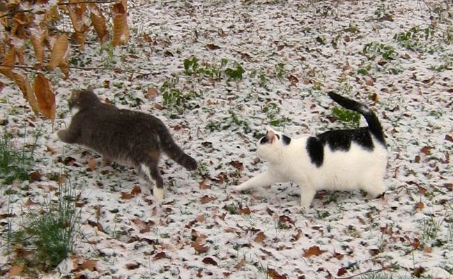 So let me introduce you to Pauline and KittyPoo, Smudge Bucket and Waldo, Big Mama and Thom and Double (so called because she accidentally got sterilized twice). What’s funny is that each person who feeds them has their own names for them, reminding me of T.S. Eliots great poem, "The Naming of Cats". In which every cat has three names, but the Poubellies have even more. Photos: above,Pauline scratches an itch; Pauline and Big Mama in the snow. Left, Thom and Kittypoo (Domino's twin?)
