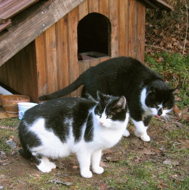 Other people dropping off their bottles and such started feeding the cats periodically, which inspired more folks to abandon their cats there, and pretty soon there was a bevy of chats sauvage–feral cats. After one was run over, the neighbors took action. Unable to find homes for all of them (though Lord knows we tried), we moved them down the road to a quieter spot, built them a little cabin for food, and formed a group to feed them properly. The Poubellies, as we now call them, have been there three years now; there are seven of them, as cute and sweet as can be. All neutered now, and mostly tame.