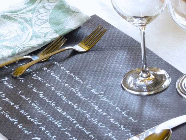 We ate in a new restaurant in Cluny the other day (Le Pont de Cotte), and they had a unique paper placemat. I don’t often find inspiration from a placemat, but this one had a list of famous quotes about food, done up in a pretty calligraphy font.