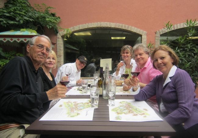Photos: above, the hotel; the wine shop by the creek. Below, our group wishes you bonne santé; le coq is the Blanc symbol.