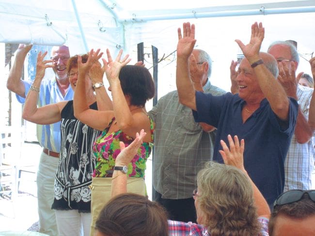 The first and easiest one, unique to our region, is called "Le Ban Bourguigon". There are no words to this one, it basically just involves clapping and turning your hands in unison, with lots of la la la’s, though the tune is tricky. You can see it done with a large group, at this youtube site. Photo: doing the Ban Bourguigon at the château for Nicole's birthday party.