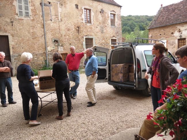 That is, after they’ve renovated the new purchase, AND moved many decades of accumulated stuff out of the chatêau. Yesterday, for example, was a workday (with pizza for lunch) for our crowd. Even our US houseguests Jack and Emily—visiting us for a few days after their Paris honeymoon—were pressed into service. We packed up literally hundreds of dinner plates, hundreds of dessert plates and glasses. After all, there are four kitchens in the château, not to mention all the other stuff. Photo: Bye-bye to all that.