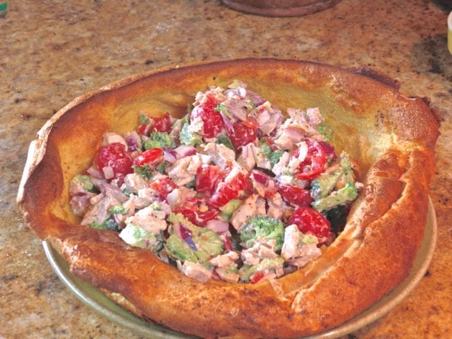 You will need a good Cast-Iron Skillet to make a proper pancake. I use a recipe similar to this one at Epicurious, though I use milk instead of cream, and I use a whisk instead of the blender. (If you're going to serve it the traditional way, I find that brushing it with butter after it cooks is unnesscessary, as they suggest. Just sprinkle with lemon and dust with sugar). Note that this recipe is for two 10" skillets, so cut it in half if need be. Photo: Serve it with turkey salad, to cut in wedges, like this…or roll it up as below, and cut it in slices like the lead photo.