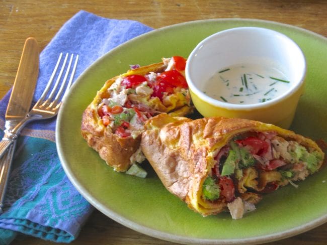 But I took it one step further and made a fancy roll up.I took that same turkey salad filling, which I fluffed up with some leftover cooked broccoli and chopped cherry tomatoes, and rolled it right up inside the popover (I went very light on the mayonnaise for the salad, just enough to bind it, as there will be a dipping sauce). Then I cut it into slices. I stirred together a little dipping sauce by thinning out some créme fraîche with half and half, and adding a touch of dijon mustard and some chives. The only tricky part: if your pancake sticks to the pan, you’re toast!