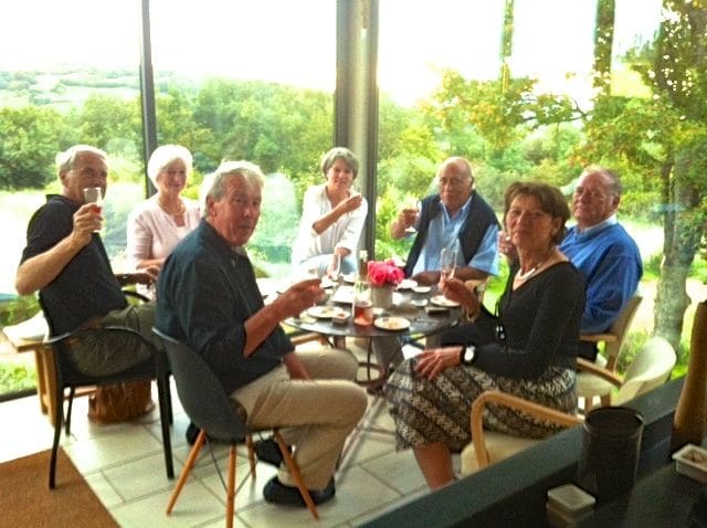Bring a Gift. Wine is not the thing to bring, it suggests you’re trying to play sommelier for the evening. Bring a little hostess gift of some sort, or a plant or flowers (already arranged, please). We often bring wine AND a gift, but we will whisper in the host’s ear, “Here’s a little something to tuck away in your cave.” Photo: Dining with French friends this past summer.