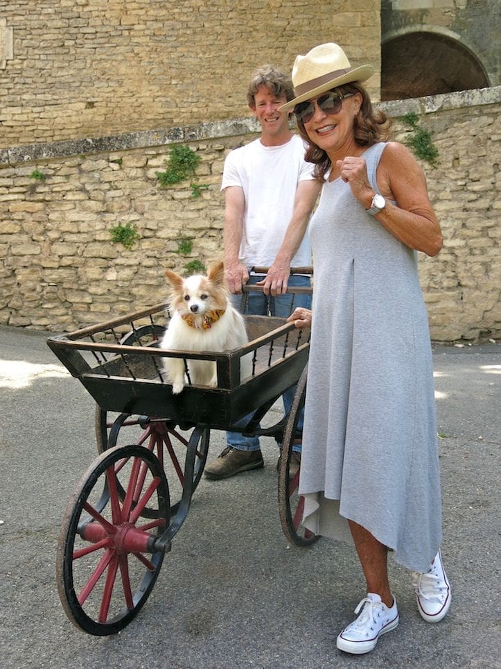 Photo below, Alix by a stone wall in her village, with her precious dog Mignon and her chauffeur