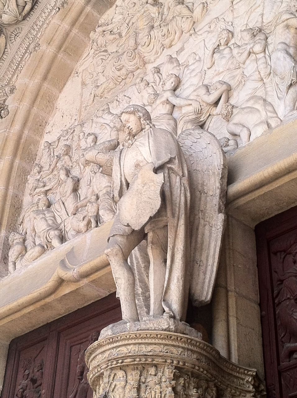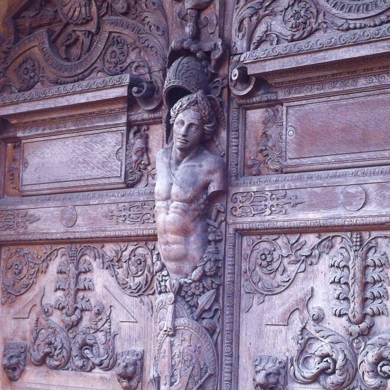 Dijon details, below: Entry to l'Eglise Notre-Dame de Dijon; and a carved wooden door from one of the many gorgeous churches.