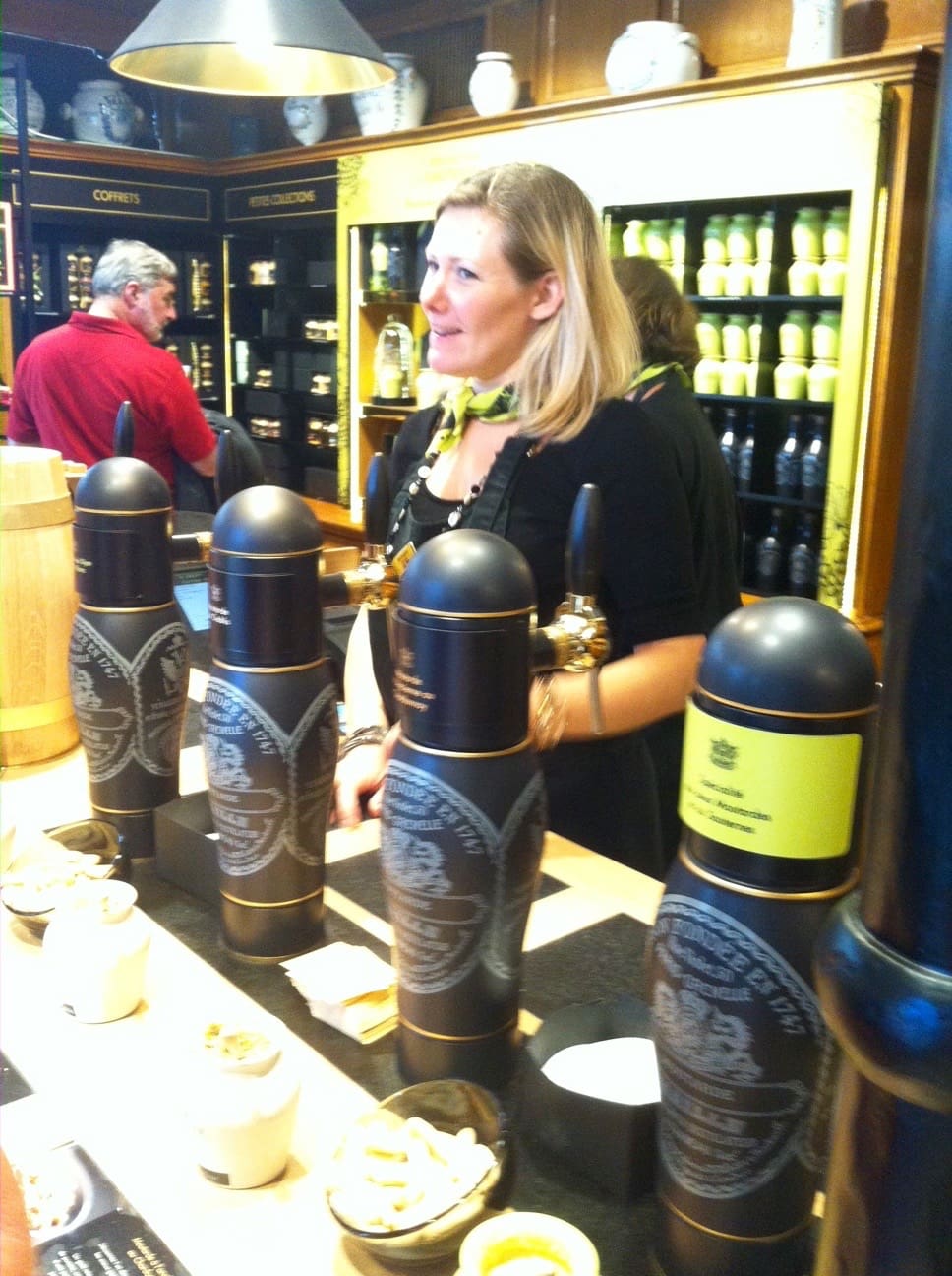 Photo, right: Serving up mustard en vrac, laced with various white Burgundies. You can find some of the Maille flavors in the US.