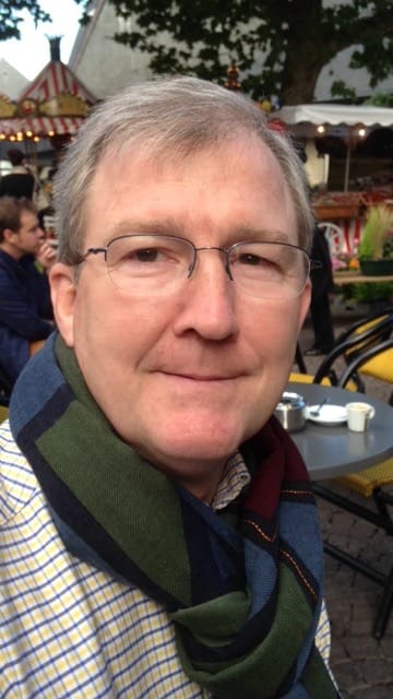 And getting back to our post on French scarves, our reader Kerry writes that American MEN wear scarves, too–at least when there in France! Her husband Joe sports one when he crosses the pond. She sent a photo: here's Joe, rockin' a French scarf. Tellement chic, Joe!