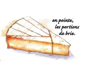 Easy enough. But if a wedge from a large round is served on a platter, like a big slice of brie, the rules change. In this case, the first cutter slices off the nose, but at an angle, never straight. The next person cuts a diagonal slice, making a smaller wedge. Subsequent diners cut perpendicular to the rind. Got it?