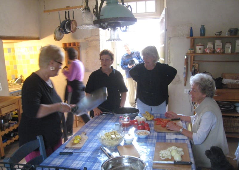 At the Château de Balleure, the indoor kitchen was small, and on the second floor (the main living space). But on the ground floor, just off the courtyard, the summer kitchen was actually the main kitchen in the château. Opening to the courtyard by an over-sized french door, it had a huge wood burning and gas stove, two sinks, a giant armoire, a big table in the center for prep, a walk-in pantry, a couple of fridges and three freezers. Many a fine meal en plein air had its origin here (see photo at right).