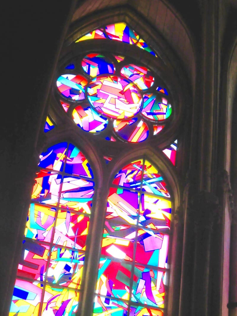 Inside, it has the usual reverent elegance of a French cathedral, only bigger. But they've done something very interesting and very French, as the French have no fear of mixing the ultra modern with the ancient (SEE the pyramid at the Louvre). In the rear nave, they've replaced the towering stained glass windows, destroyed when the cathedral was bombed in WWI, with unabashedly modern stained glass by artists Marc Chagall, Imi Knoebel, and Brigitte Simon-Marq. The effect is spectacular.