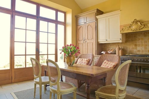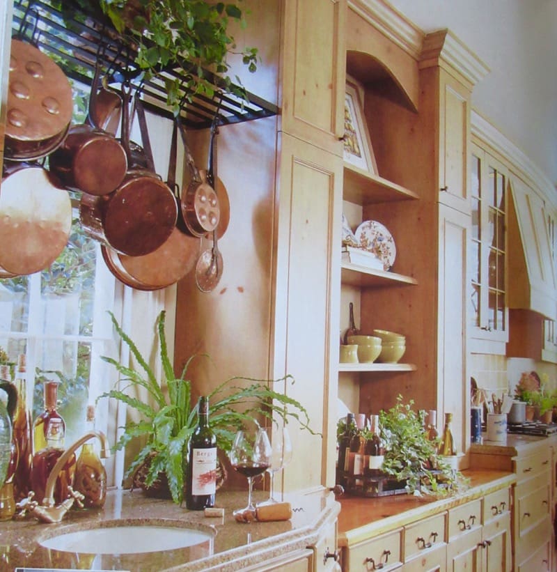 Sigh. I look at these kitchens and wish for what I can’t have. We have always lived in historic houses in our U.S. city. On the first floor they had large formal spaces (LR and DR) but only small kitchens — 10×10 if you are lucky because when these Craftsman-styled houses were built the only person in the kitchen was the mother or the housekeeper. I was ready to push out the back of the house so I could have a work table in the middle, a walk-in pantry, art on the walls instead of cabinets. Instead, though, we moved to another old house that needed fewer updates because we are too old to live through two years of renovation. Alas, I still have the small Craftsman kitchen and am forced to have an island instead of a center table because we need somewhere to put the sink and dishwasher. But I can at least be picky about finishings. Wood to warm it up, a sunny wall color, a special Motawi(or other) tile mural on the range hood, framed art and my American art pottery quite prevalent, and hanging my rolling pin collection on the wall instead of shutting it away. I think one thing that makes the French Country style so appealing is that it looks lived in — objects curated over a lifetime rather than put together at a big box store.