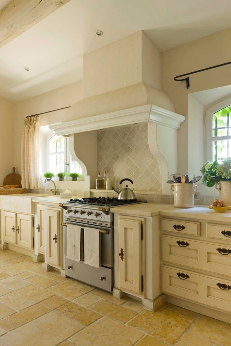 Alix Rico is an American interior designer living in France (and New Orleans). The setting is an old French house, Provençal, and so is the look, which she has nailed. Love those beautiful windows and curtains, and the plaster range hood which is true to the look of a French fireplace. (This kitchen was featured in Country French).