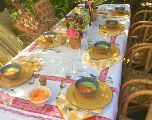 First the l'entrée (starter): My best summer party trick is: a split bowl of soups! This is a really pretty presentation, and it’s easy. Make gazpacho and cucumber soup in the blender–see below for the how to.